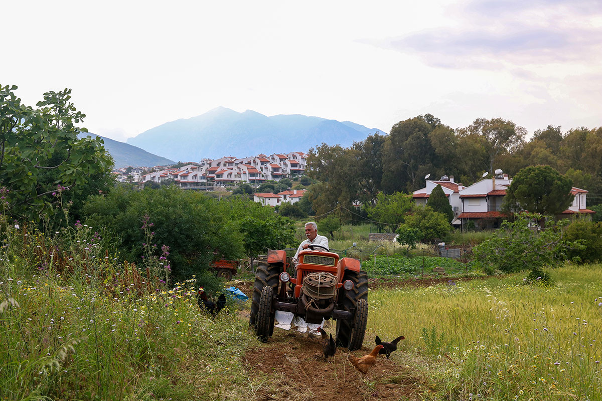 KOVALAMACA: Ardında büyüyen bir heyula gibi siteler, üstüne ha çullandı ha çullanacak. O sitelerdeki insanlar satın alacak Datça pazarında çiftçinin ürününü ama biliyor mu bunu beton, demir, doğramalar? (Fotoğraf: Ayfer Gençer)