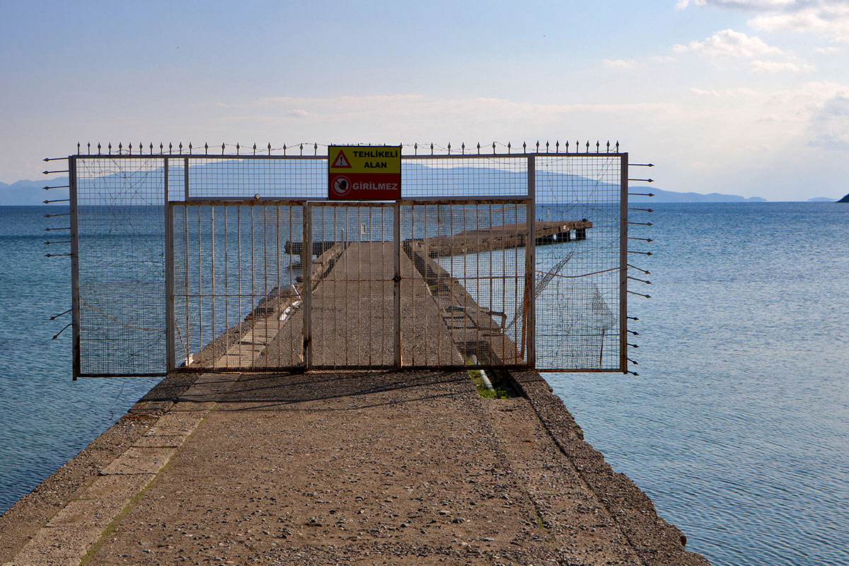 YASAK: Burgaz’a giderken Sevgi Yolu’nda 1980’lerden kalma taş iskele durur, denize bir hançer gibi saplı. Korozyonla erimiş demirleri, çökmüş betonuyla yara bandı. Git gide büyütülen parmaklığa inat balıkçılar ve aşıklar bir yolunu bulur iskeleye çıkmanın. (Fotoğraf: Birgül Abuşka)