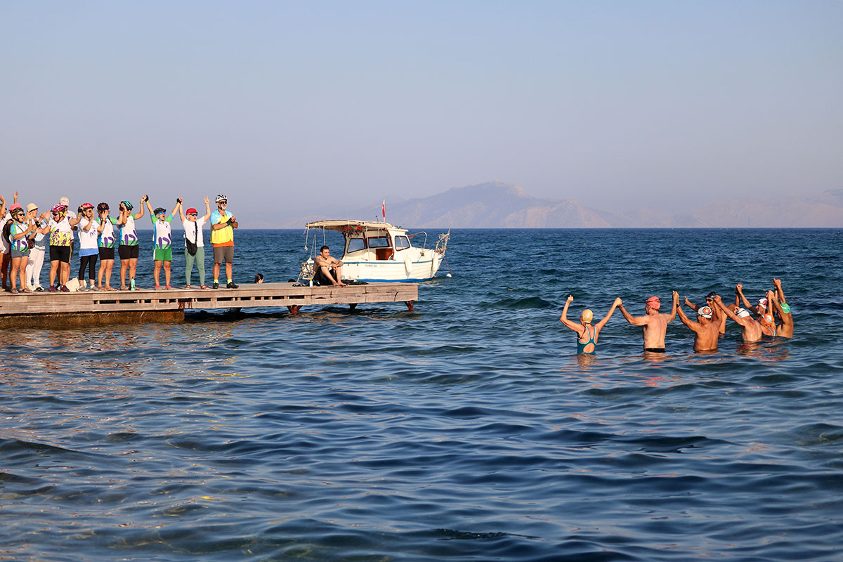 HAVLU: Şezlongsuz Datça için Neşeli Kıyılar Şenliği’nde bisikletçiler, yüzücüler ile buluştu. Otellerin kıyıları işgaline karşı çıkıyorlar, havlularını özgürce halkın olan kıyılara atabilmek istiyorlar. Karanfil elden ele. (Fotoğraf: Ayfer Gençer)