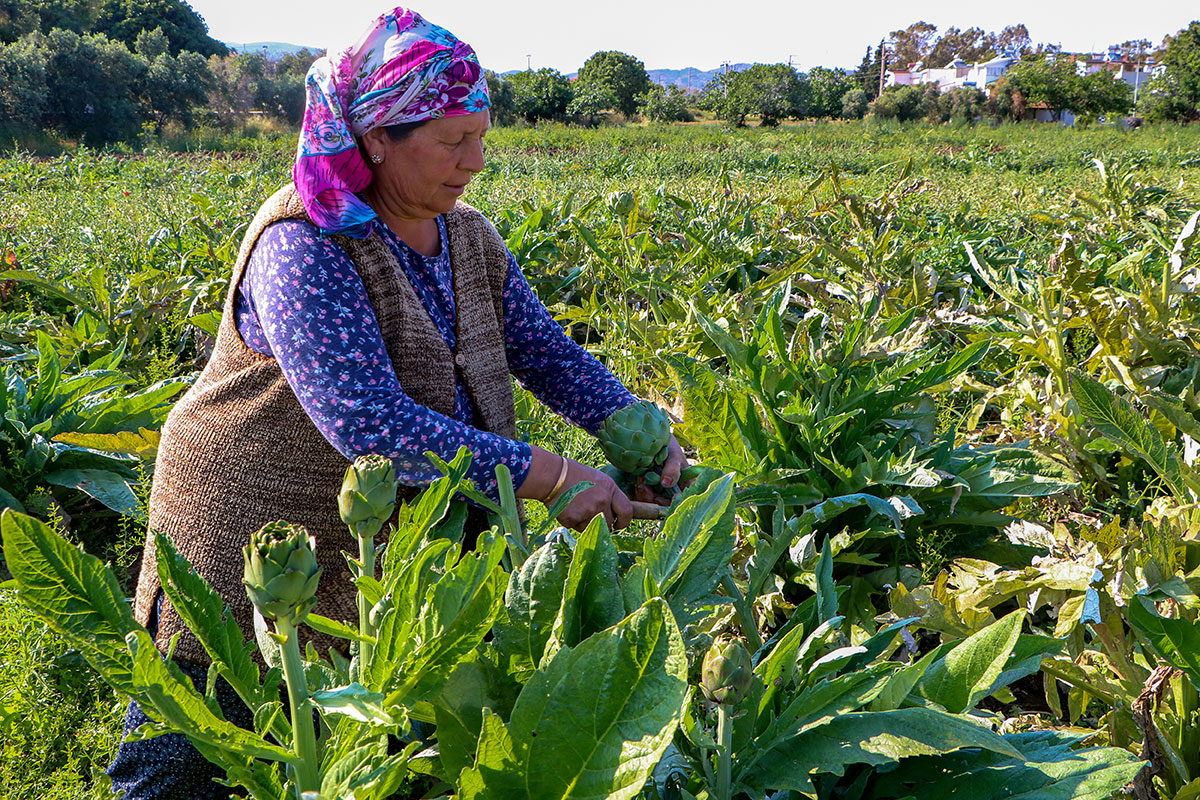 HASAT: Sakine Hanım Burgaz’da on dönüm tarlasında enginar yetiştirir. Hasadın ertesi günü Datça pazarında satar. Bu enginarları yiyenlerin damağında arkaik bir tat kaldığı, gece rüyalarında kendilerini Burgaz’ın taş döşeli sokaklarında bir şenliğin içinde buldukları rivayet edilir. (Fotoğraf: Birgül Abuşka)