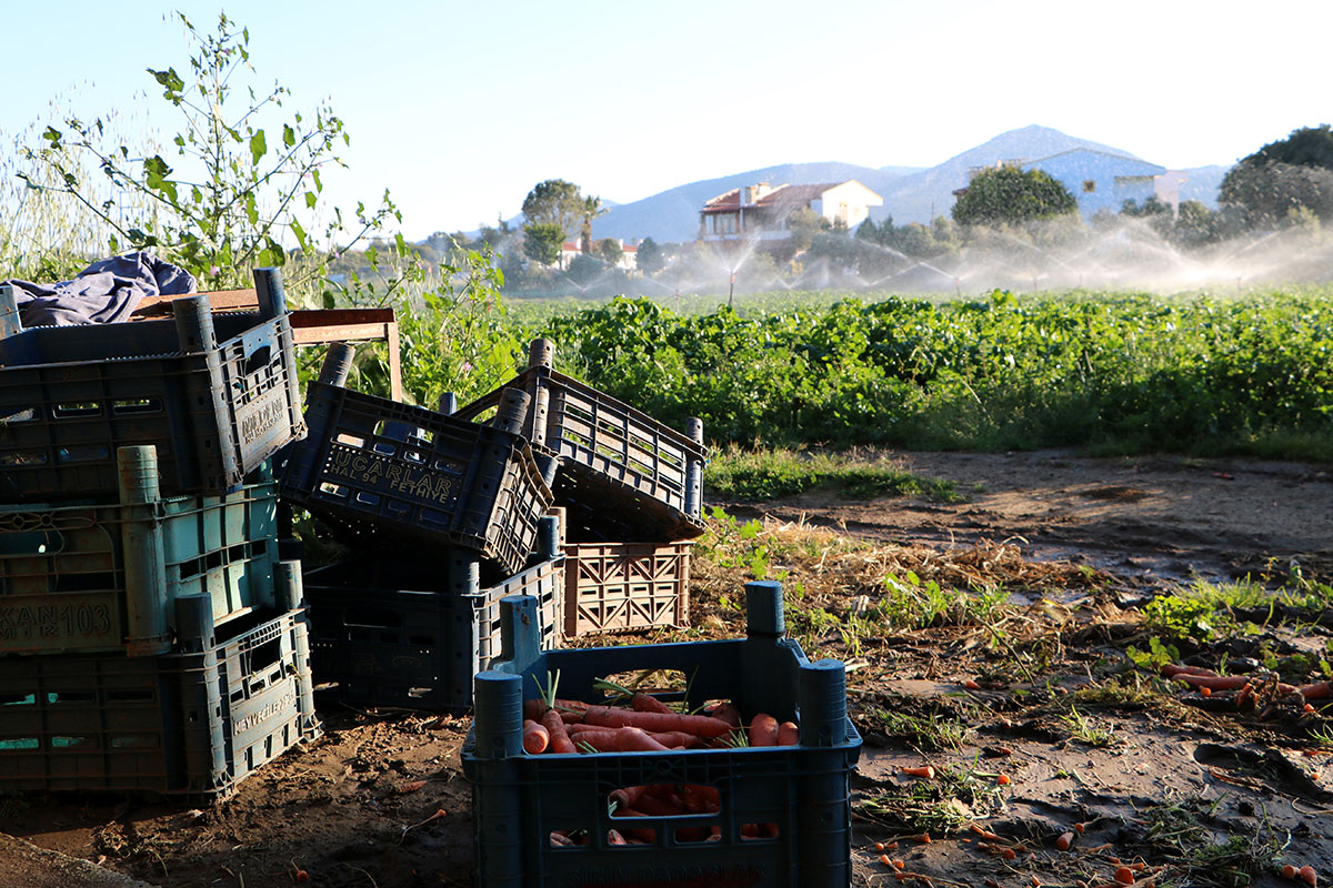 SU: Verir Burgaz’ın verimli toprağı, verir de verir kasa kasa havuç, patates, domates. Akşamüstü sıcak kırılınca tarlalar sulanır fıskiyelerle, Datça’nın her damlası değerli suyuyla. (Fotoğraf: Birgül Abuşka)