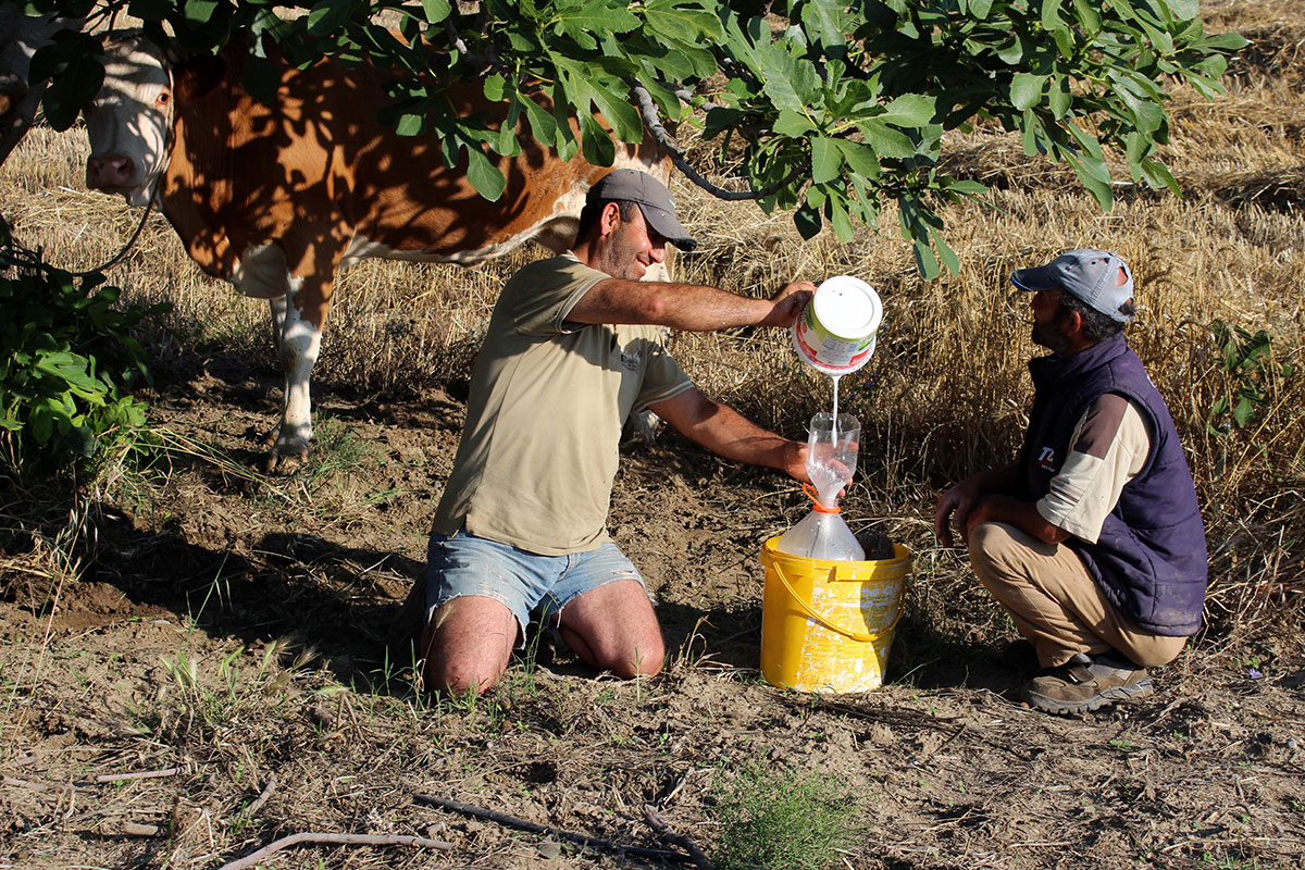 SAĞIM: Sabahın erken saatlerinde alışkın, hızlı eller ineği sağar, yüzyıllardır yaptıkları gibi, kıvamlı beyaz süt kovaya dolar, inek uzaklara bakar durur ermişlere has bir sabırla, çimen kokar, dünyanın en gürültücü sinek ve arı orkestrası müziğini yapar Burgaz’da, iki antik liman arasındaki yükleme-boşaltma platformunda. (Fotoğraf: Ayfer Gençer)