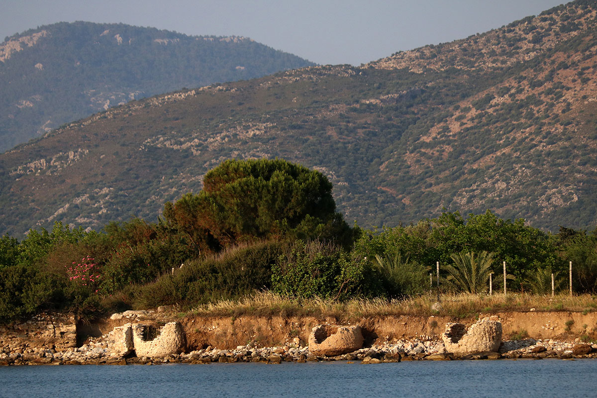 ŞARAP: Sadece dördü kısmen ayakta kalmış, In-situ şarap depoları (Dolia). Antik çağlarda, Burgaz’da üretilen ‘tatlı şarap’ Dionysos şenliklerinin vazgeçilmeziydi. Bu depolarda saklanan meşhur şarap amforalara konur, koca karınlı gemilere yüklenir ve Akdeniz’e dağılırdı. Kıyının içeri girmesi ile şimdi açıkta dururlar, Ege’nin sersemletici, dağıtıcı lodos dalgalarına karşı koymaya çalışırlar. (Fotoğraf: Ayfer Gençer)