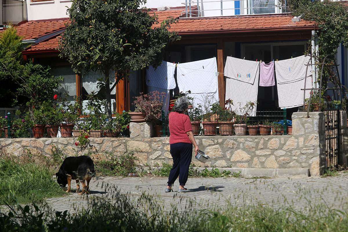 KOMŞU: Komşuluk sürer Burgaz’da. Sokak sakinleri insanlar, köpekler, kediler. Ayaküstü sohbetlerin tadına doyulmaz, çamaşırların beyazlığı, yemek tarifleri, bazen havanın sıcaklığı, yağmurun yağmayışı, biraz politika, biraz “nerede o Datça’nın eski hali” üzerine. (Fotoğraf: Ayfer Gençer)