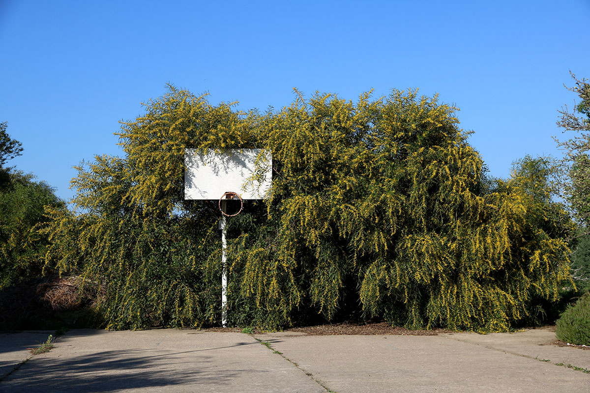 AKASYA: Doğayı bıraksanız her şeyin üstünü örter, yutar, kendi rengine boyar. Çocuklar büyüyüp gitmiştir, topun havası inmiştir, sahanın betonunu yağmur fırtına eritmiştir, potayı da Kıbrıs Akasyası saklamak ister. (Fotoğraf: Ayfer Gençer)