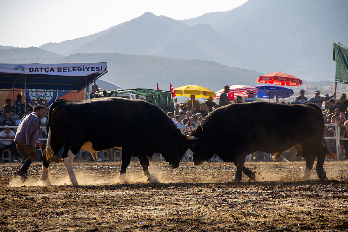 BOĞA: Her yıl hasat sonrası, ekim ayının son haftasında, Apollon kültünden günümüze kalan, yerli halkın çokça ilgi gösterdiği geleneksel boğa güreşleri düzenlenir. Hayvanseverler protesto ederler. Yerliler ise boğalarına bebek gibi baktıklarını, onları en iyi şekilde yaşattıklarını anlatarak kendilerini savunurlar. Bu çekişme sürüp gider. (Fotoğraf: Ahmet Asatekin)