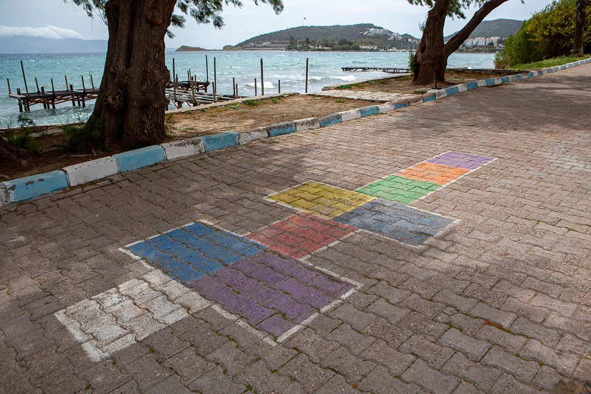SEKSEK: Burgaz’a doğru yürürken Sevgi Yolu’nda karşına çıkıverir bir seksek tahtası. İçindeki çocuk cıvıl cıvılsa hoplaya zıplaya geçersin, içindeki çocuk utangaçsa kenarından dolaşır göz ucuyla bakarsın, içindeki çocuğun öldüğünü sanıyorsan uzaktan da olsa seslenir şimdiki sana, hatırlarsın. (Fotoğraf: Püren Türker)
