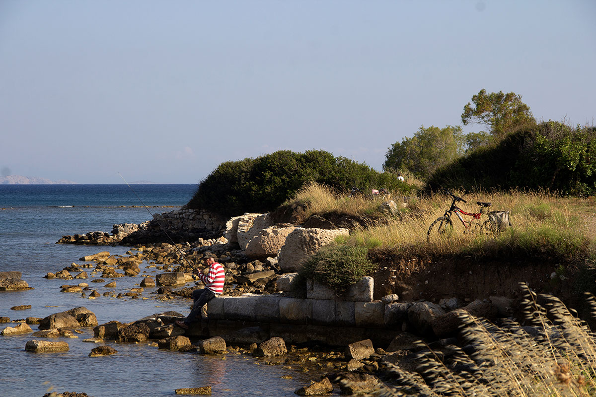 BENZEYİŞ: Deniz çekilmiş, L4 limanı kıyısında yuttuğu Hellenistik-Roma içliklerinin yapı taşlarından elini çekmiştir bir süreliğine. Eski duvarın ucuna oturursun elinde olta. Belki saatler sürecek sabırlı bir bekleyişin içinde Burgaz gibi, Burgaz’a benzeyerek oturursun. (Fotoğraf: Ahmet Asatekin)